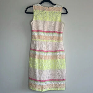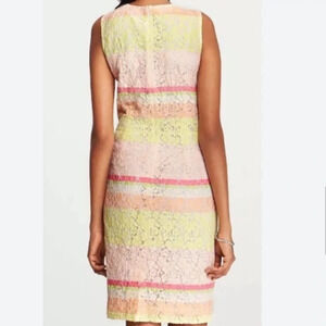 Ann Taylor sleeveless dress. Perfect for any occasion, this dress features a delicate lace overlay with colorful pastel stripes, offering a fresh and elegant look. The flattering sheath silhouette hugs your curves in all the right places, while the high neckline adds a touch of sophistication.