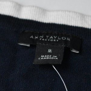 Navy blue sleeveless wrap top with white border and a beautiful bow wrap on the side. It has a light sweater texture.