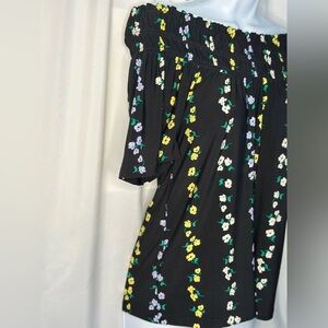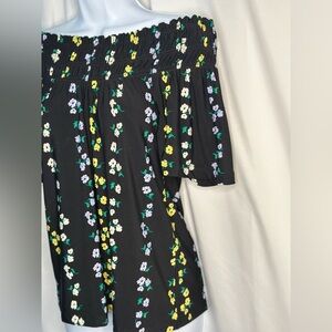This elegant blouse by Ann Taylor features a relaxed smocked design with short sleeves, perfect for a chic yet comfortable look. The black base is beautifully accented with a floral vine pattern in yellow and white, adding a touch of charm to any casual ensemble. Ideal for everyday wear, this top effortlessly combines style and comfort.