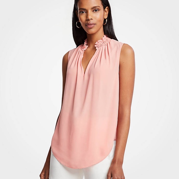 Topped with a smocked ruffle collar, this flattering shell has a split neck you can wear hooked or unhooked - for two looks in one. Split neck ruffle collar with button closure and shirring beneath. Sleeveless. Shirttail hem. Lined. 27 3/4" long.