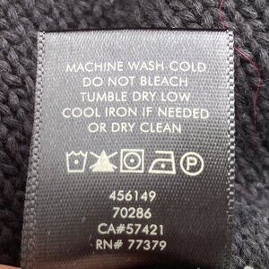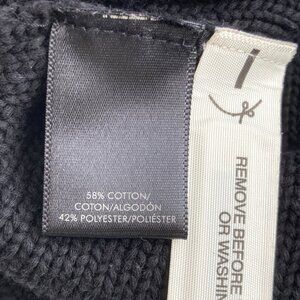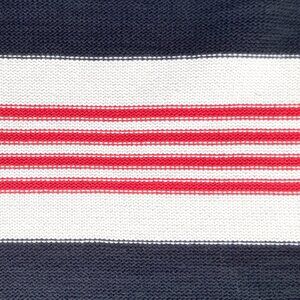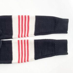 Sporty knit pullover from Ann Taylor is black with a wide center stripe of white and four thinner red lines within. Banded cuffs and side slits. Durable cotton/poly blend.
