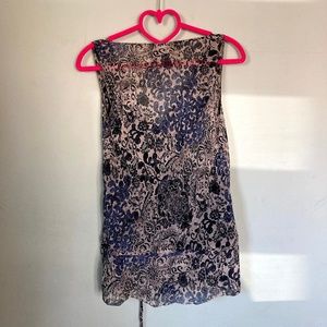 Floral / Paisley colorful design with black cami underneath . Side tie style. Really cute and slightly asymmetrical :) Can fit small or xs