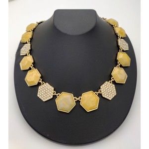 Gold tone metal. Geometric yellow, rhinestone links. 20 inches long.