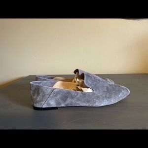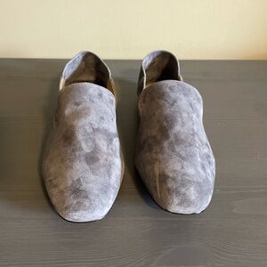 With a simple step to its foldable back heel, this suede slip-on transforms into an even more comfortable slipper. Rounded pointy toe. Padded footbed for complete comfort. 1/2" heel. Ann Taylor Step Back Suede Smoking Slippers