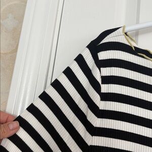 Chic and versatile, this ribbed striped black and white top is perfect for any occasion. Its classic design offers a timeless look. Boatneck and 3/4 length sleeves. Charming feature of ruffled neckline, hem and cuffs. Unique take on a great striped top. Lots of stretch. Fabric is Rayon and Spandex. Measures 20” across chest, with no stretch. 22” when stretched. 25” long. Washable and in Excellent Condition.