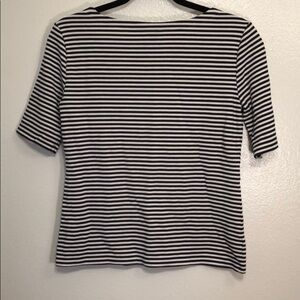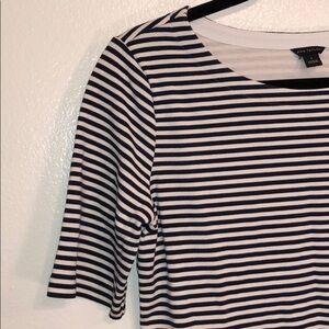 The inner tags are cut out but this shirt is SO soft!! It’s a thicker material with a lot of stretch! Navy and white horizontal stripes! It’s a longer sleeve but still considered short sleeve.