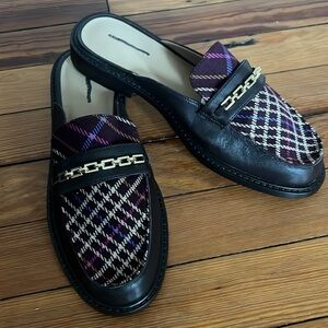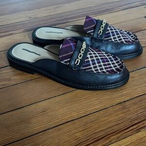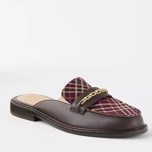 Ann Taylor Stylish Chocolate Brown Leather and Plaid Loafers Gold Chain Accent 6
