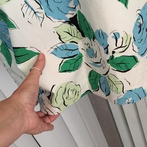 This is cute. Off white dress with big blue and green cabbage roses. Fine piping suggests a waistband. There is a very small stain see photo #4 for detail. It is difficult to see unless closely inspected. Otherwise great condition