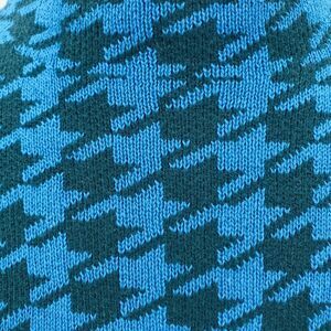 This Ann Taylor sweater is a colorful and classic houndstooth pattern pullover with a mock neck. It is made of a tight-knit blend of polyester, nylon, viscose, and cotton, and is machine washable in cold water. The sweater has long sleeves and comes in size small, perfect for casual occasions. It measures approximately 18.5" from armpit to armpit and 22.5" from shoulder to bottom. The teal and pine green colors of the sweater bring a preppy touch to any wardrobe. It is in excellent preowned condition.