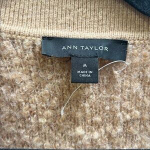 Ann Taylor women's cardigan in a warm tan hue. Bouclé textured knit for cozy layering. Deep V-neck with a button-front closure. Ribbed cuffs and hem for a neat finish. Neutral tone pairs easily with many outfits.