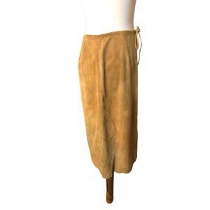 Ann Taylor Tan Geunine Suede Leather Eyelet Knee Skirt Fully Lined Size 6. Has tie at waist, hidden zipper and hook closure. Very southwestern, cowgirl western vibes. Knee length.