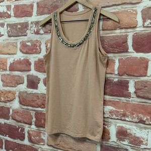 Ann Taylor Tank Top Women's Tan Pink Raw Edge Jeweled Neck Sleeveless Shirt