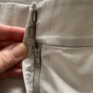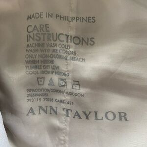 These Ann Taylor Bermuda shorts in khaki are crafted from a structured fabric, offering a polished look with their flat front design and tailored waistband. Ideal for a professional setting, they feature a mid-thigh length and pressed creases for a refined appearance. In excellent preowned condition with no flaws.