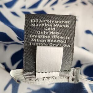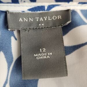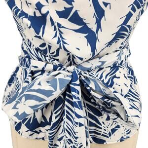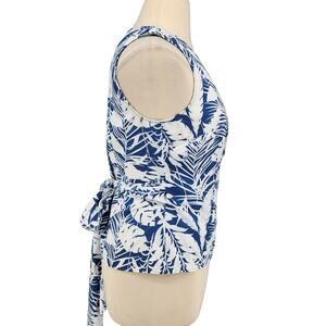 Tailored and breezy, this sleeveless blouse by Ann Taylor features a blue and white tropical leaf print with a flattering wrap-style front. Crafted in lightweight polyester with a fitted waist and adjustable tie detail, ideal for warm-weather styling or resort-inspired looks.