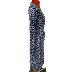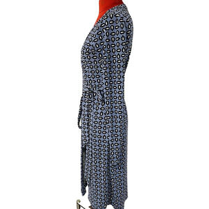 Ann Taylor True Wrap Dress - Size 2T (Tall) - done in a sleek gray-ish blue with black & white repeating pattern all over. The style is classic with v-neck, self tie at the waist and long slim sleeves. The fabric polyester blend - easy care with a soft finish but an elegant drape that looks very elegant and expensive. In excellent pre-owned condition - no flaws - perfect for a dinner out or add your jacket for a day at the office!