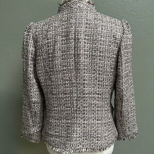 Sophisticated tweed blazer with a double-breasted design. Features a textured pink and white pattern. Perfect for professional and casual settings.