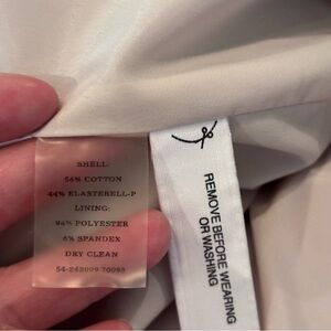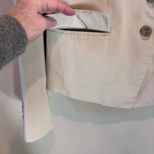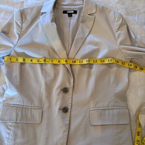 Ann Taylor Two Button Blazer in Light Khaki/Stone Color, size 4, Notched lapel,Functional button Cuff Sleeves, Two button front, Front Flap Pockets, Back vent, Lined. Shell:56% Cotton, 44% Elastanerell, Dry Clean. In Good Pre-Owned Condition, Approximate Measurements in Pictures.