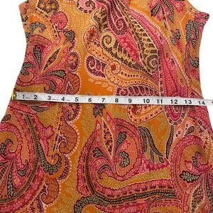 This sleeveless paisley dress features a vibrant orange and pink pattern with a flattering halter neckline and tie-back detail. Lightweight and breathable for warm weather.