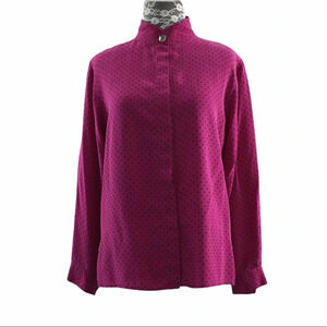 Ann Taylor Pink Polka Dot Button Front Silk Shirt. Long sleeves; mock neck. 100% Silk. Womens size 4. Pre-owned. Button right sleeve chipped.