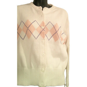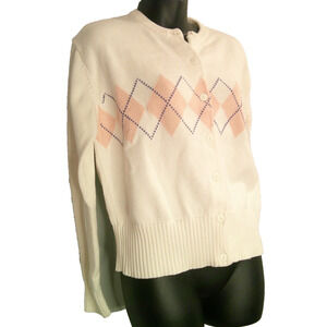 Ann Taylor Vintage Women's Large White Button-down Sweater Cardigan with Argyle