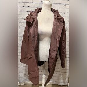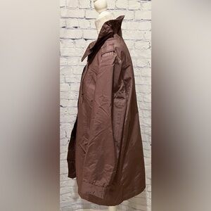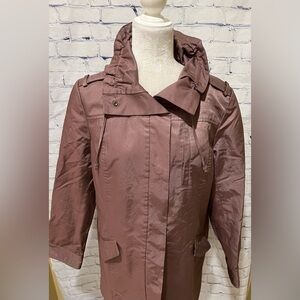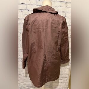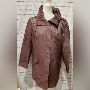 This is an Ann Taylor Walnut Brown Funnel Neck Knee Length Coat in size XL for women. It has a classic fit with long sleeves and hidden front snaps. The coat is made of cotton, nylon, and polyester materials, with a polyester lining and insulation. The color is a shade of walnut brown, and the neckline can convert to lay flat. This versatile trench coat is machine washable and suitable for all seasons. No belt. 25 inches pit to pit and 25 inches long. Smoke free home.