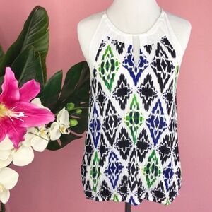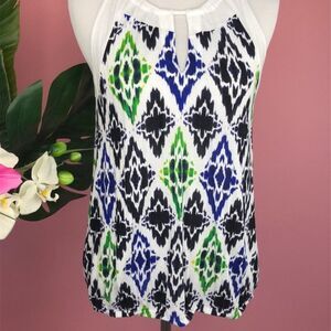 • Ann Taylor White Multi Ikat Design Keyhole Top