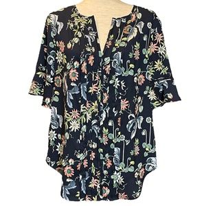 Ann Taylor Wild Flower Pintucked Flutter Sleeve Top. Crisp front pintucks. Flutter sleeves with lace cutouts. Split neck. Shirttail hem. Navy blue floral print.