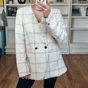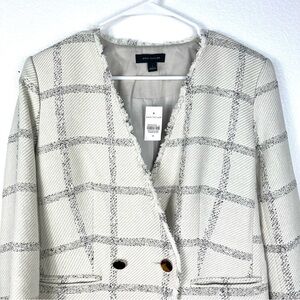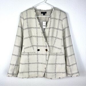Windowpane tweed double breasted blazer. Ivory with navy. Fully lined. Back vent. Cotton/ polyester blend.