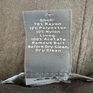 Material: Shell 78% rayon, 12% polyester, 10% nylon" Lining: 100% polyester. No belt.