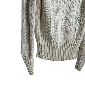 This Ann Taylor pullover sweater is designed for women and comes in a regular size medium. It features a chunky-knit style in a solid beige color, made from a blend of cotton and acrylic. The sweater has a crew neck and long sleeves, making it suitable for casual occasions, especially during the fall season. Manufactured in Hong Kong, it is machine washable for easy care. The sweater is pre-owned.