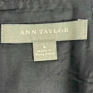 This Ann Taylor skirt is a size 6, straight and pencil style, designed for women. It is knee-length and comes in a solid black color. Made from a blend of cotton, rayon, and acetate, the fabric is textured and suitable for all seasons. Ideal for business occasions, this skirt is not vintage and was manufactured in Hong Kong. It requires dry cleaning and is not handmade. The skirt is pre-owned. Excellent condition