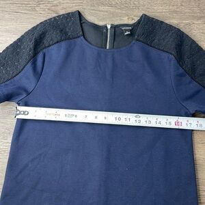 Ann Taylor Women’s Black and Navy Blue Short Sleeve Blouse, size Small. In great used conditon. See pictures for measurements and fabric content. Black lace on shoulders and back zipper.