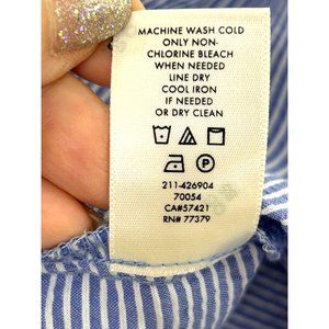 1001B- Ann Taylor women’s blouse, size small, 59% cotton, 41% lyocell, light blue, mini horizontal stripes of light and darker blue, round banded neckline, with deep v- notch. Gathered shoulders, does not stretch, made in Vietnam. Machine wash, cold, nonchlorine, bleach, if needed, line, dry, or dry clean.