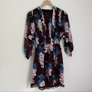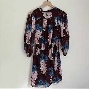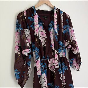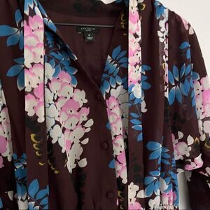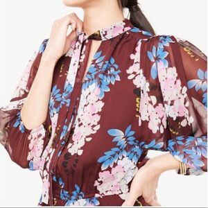 Ann Taylor women’s floral tie neck shirt dress/mini dress in brown/dark red colors with blue and pink floral pattern. Size small petite.