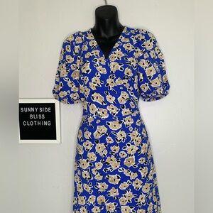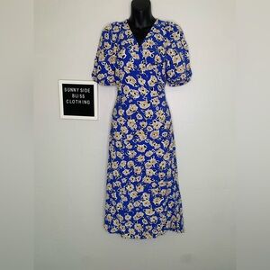 This is a navy blue v neck maxi dress with a cream floral print. It wraps around the front and ties in the back. It’s a size 0 in great pre owned condition no stains or flaws.