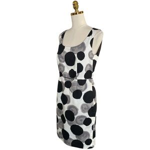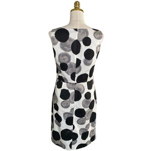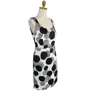 Elevate your official/party look with this Ann Taylor sheath dress, featuring a sleeveless design and a scoop neckline. The artistic polka dot pattern in black and gray adds a modern touch, perfect for a cocktail night out. Its mini length and sleek silhouette ensure a flattering fit, making it a stylish choice for any formal or special occasion.