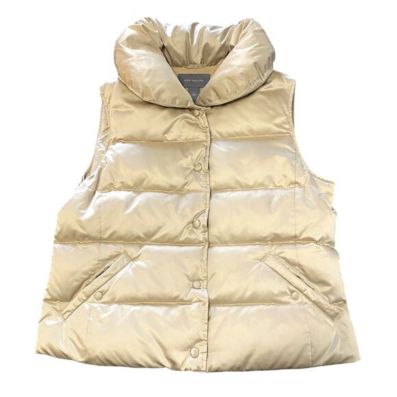 Ann Taylor Womens Puffer Vest L Shimmer Metallic Gold Fleece Lining Button Up