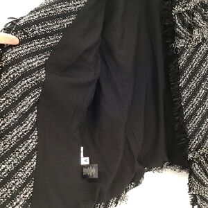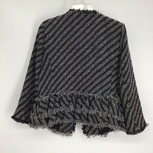 This is a very cool jacket. Great for office or just a nite out. Features ruffles at the bottom with fringe throught the jacket, one top hook & eye closure & fully lined.