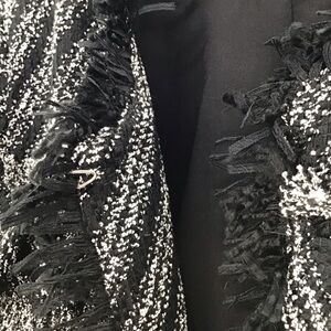 This is a very cool jacket. Great for office or just a nite out. Features ruffles at the bottom with fringe throught the jacket, one top hook & eye closure & fully lined.