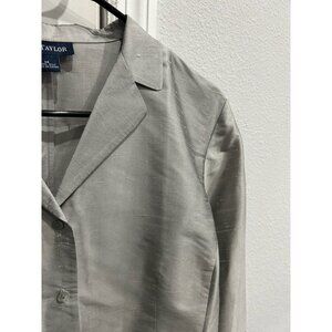 This Ann Taylor silk blazer offers a sophisticated look with its sleek silver color. Designed for comfort, it features a button-up front and a tailored fit, making it ideal for adding a touch of elegance to your wardrobe.