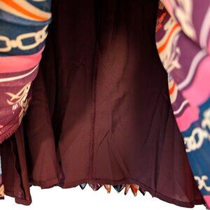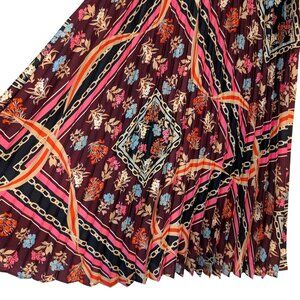 Good condition, minor signs of wear, no rips, holes or tears, pretty floral/chain scarf print, micro pleated, lined