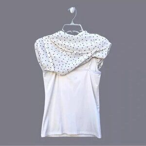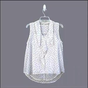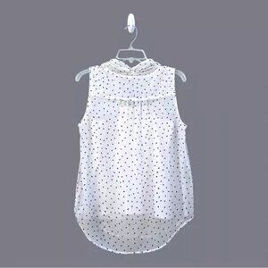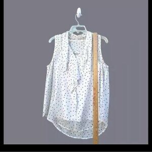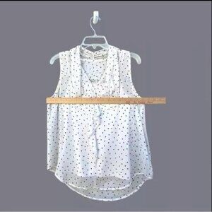 White and black polka dot, flutter front, sleeveless 100% polyester top. Blouse is sheer so I pared it with an Ann Taylor cami. Size small- measurements in pics.
