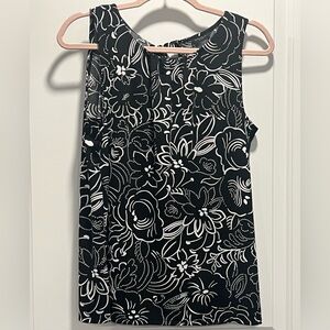 This Ann Taylor sleeveless blouse features a chic black and white floral print, a tie-back closure, and a flowy, flattering fit. Perfect for work, casual outings, or layering under a blazer.