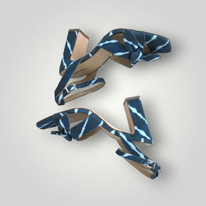 These Ann Taylor women's size 6.5M blue tie dye pattern shoes sport a fun, boho bohemian bow and a retro style. They are strappy, including ankle straps, and have a chunky block heel.