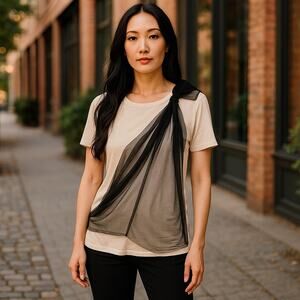 Ann Taylor Womens Top Size Small Beige Black Mesh Bow Lyocell NEW