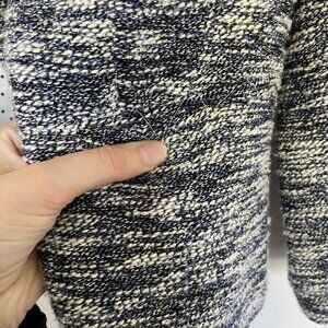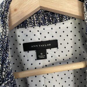 This Ann Taylor blazer combines a sophisticated tweed exterior with a playful polka dot lining. Ideal for adding a touch of elegance to professional attire.