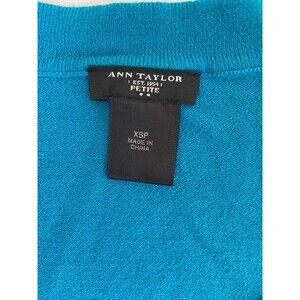 The Ann Taylor Women's XSP Blue Fitted 3/4 Sleeve Button Down Cardigan is a stylish and versatile piece perfect for a variety of occasions. This preppy sweater features a V-neckline, button accents, and a tight-knit fabric that exudes a classic and sophisticated look. Made of a lightweight nylon and rayon blend, this cardigan is suitable for all seasons and can be worn with a variety of outfits, from casual to business or even a party. The solid blue color and 3/4 dolman sleeves add a touch of elegance to this wardrobe staple, making it a must-have for any fashion-forward woman.