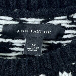 This Ann Taylor sweater in a medium size features a geometric black and white pattern, ribbed edges, and a unique side zipper detail. Crafted for cozy style.