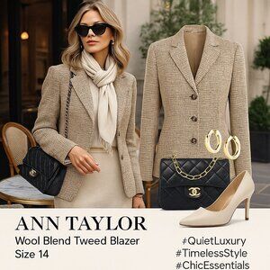 Step into timeless sophistication with this Ann Taylor wool blend tweed blazer. Expertly crafted from imported fabric in Turkey, this piece blends elegance & structure with versatile wearability. Perfect for work, weekend chic, or layered for an upscale café-style look.