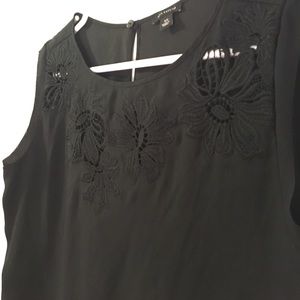 Ann Taylor XS top. 100% polyester. Worn once. Flower cut outs along neckline. Bottom has a sheer black band of fabric. If you have a long torso it may be too short of a top for you.